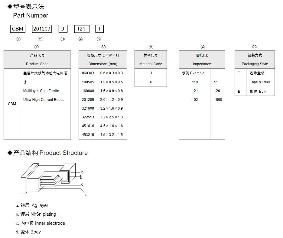 風(fēng)華高科疊層片式鐵氧體超大電流磁珠(CBM) 命名規(guī)則: