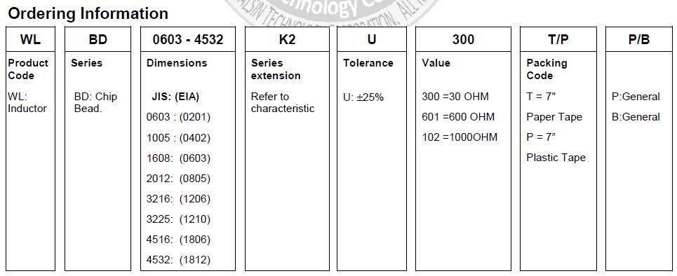 華科貼片磁珠命名規則:例如:WLBD0603-4532K2U300T/PPB