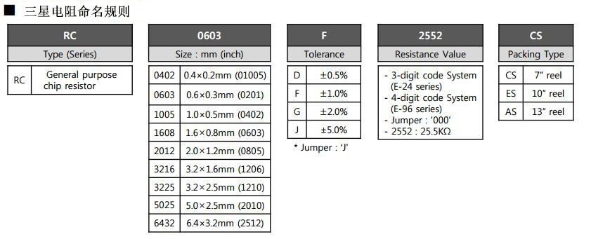 RC:表示電阻的系列名稱。RC表示一般厚膜電阻
